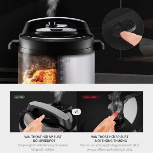 ✔️Chức năng thoát hơi nước : chỉ cần 1 chạm là có thể xả hơi áp suất dễ dàng , an toàn với nút bấm ngay dưới tay cầm của nắp.