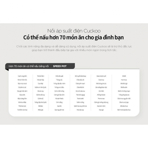 ✔️Nồi áp suất điện tử Cuckoo CMC-A0655FB đa dạng chế biến các món ăn : súp, hầm, chiên, nướng, hấp, làm bánh...thay thế nhiều sản phẩm: Nồi ninh hầm, nồi cơm, dụng cụ, máy làm sữa chua, nồi hấp...