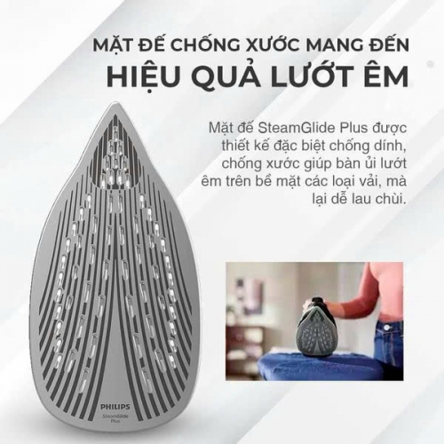 👉 Mặt đế SteamGlide Plus đặc biệt giúp người dùng lướt nhẹ nhàng trên mọi loại vải. Nó cũng không dính, chống trầy xước và dễ lau chùi.