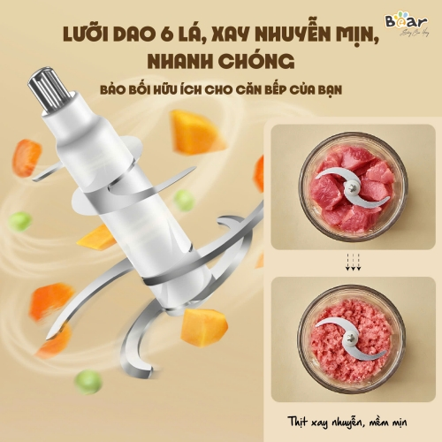 - Thông minh: 6 lưỡi dao chữ S inox 420J không gỉ, động cơ 200W giúp xay nhuyễn thực phẩm