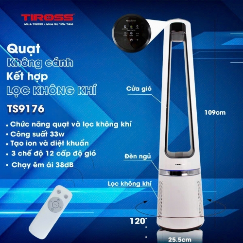 - Quạt tháp không cánh TIROSS TS9176 được thiết kế hiện đại, dễ dàng sử dụng và thân thiện với môi trường